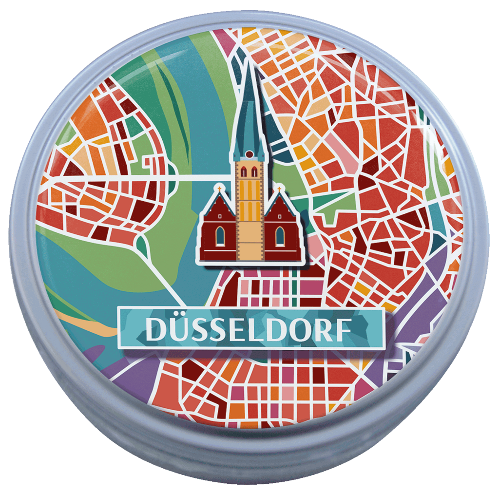 Fruchtige Bonbons in Dose mit Stadtmotiv