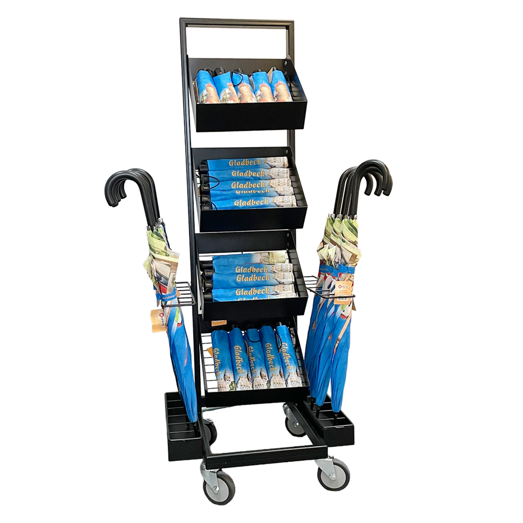 Der hochwertige Kombi-Schirmständer setzt Ihre Städteschirme ins richtige Licht. So sind Ihre Schirme geordnet, gut sichtbar und griffbereit präsentiert und lassen sich bei Bedarf schnell an eine andere Stelle im Verkaufsraum schieben.