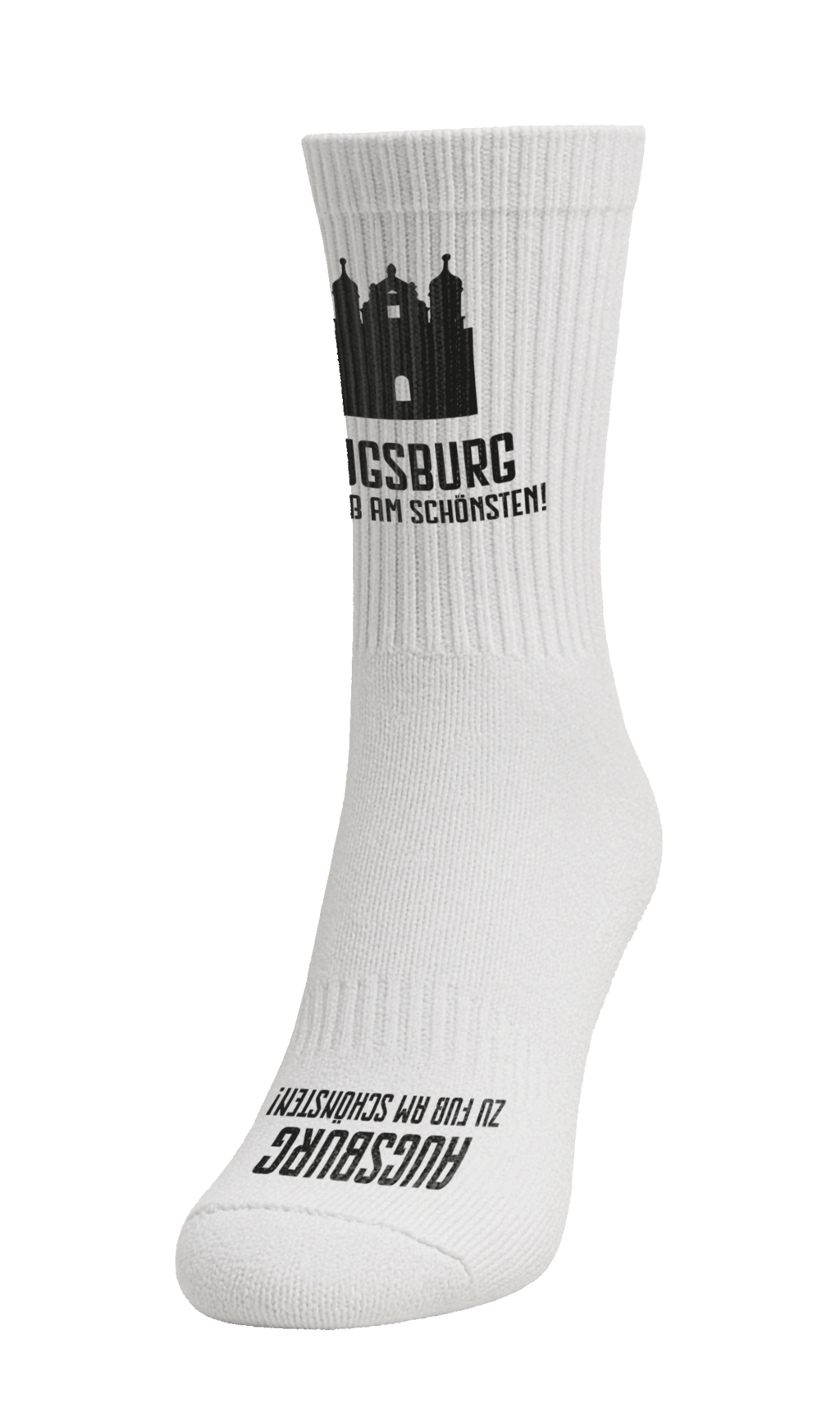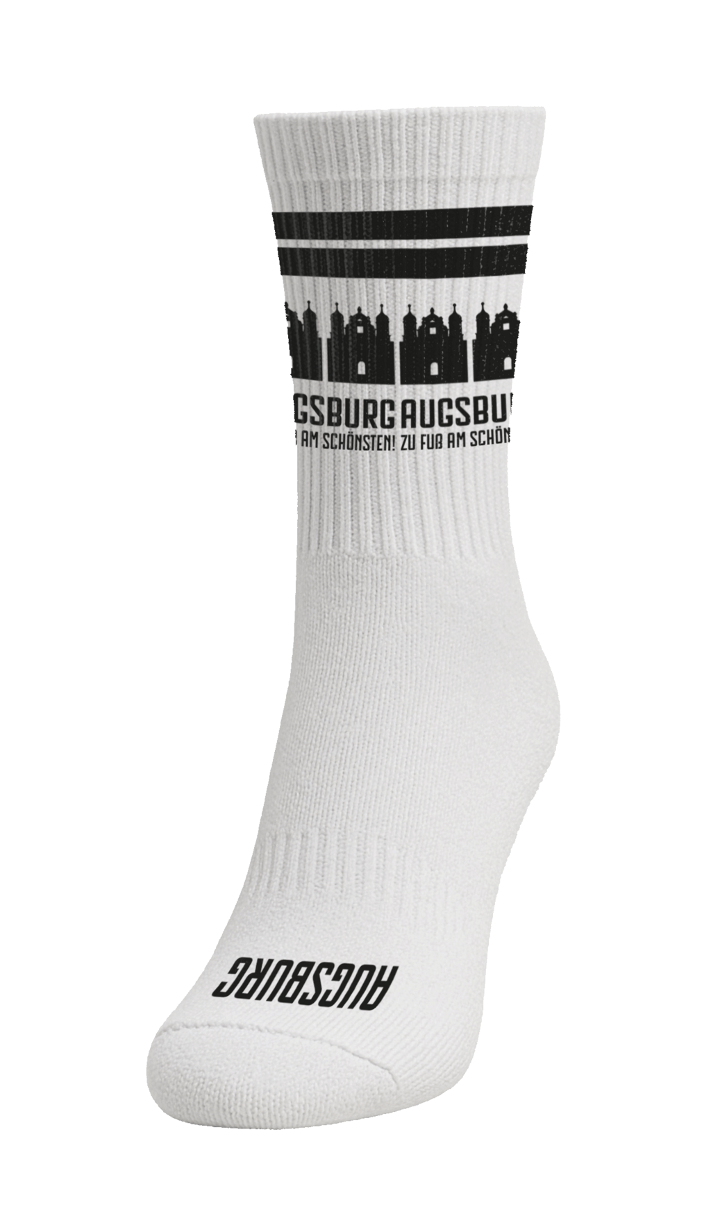 Unsere Sportsocke mit 80 % Baumwolle vereint Komfort und Design – mit individuellem Motiv Ihrer Stadt und passendem Schriftzug, in klassisch schwarz-weißem Sportsockendesign.